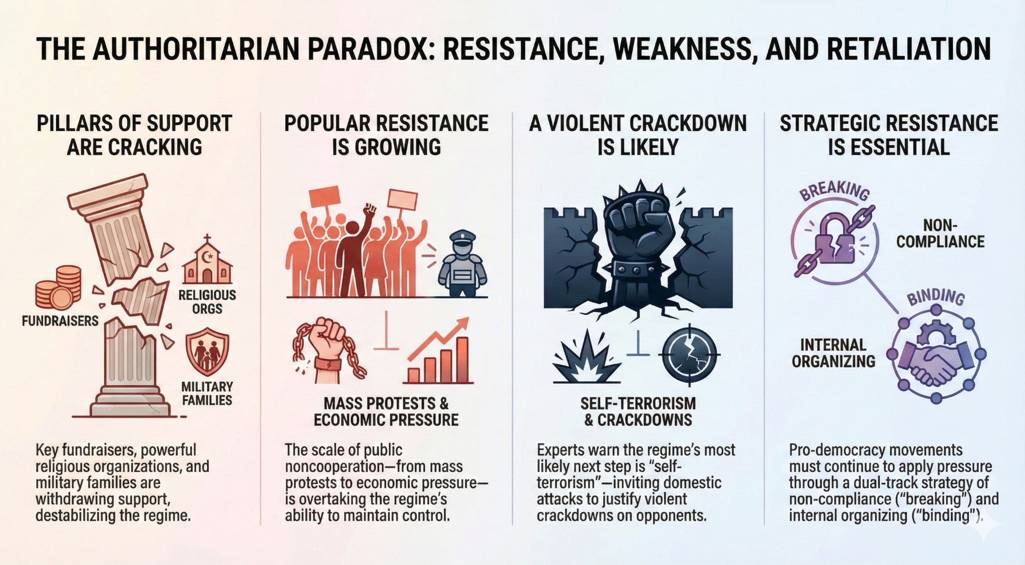 Fractures in regime pillars of support Authoritarian regimes rely on specific pillars of support like security forces, business leaders, and religious organizations to maintain power. When support from these pillars begins to weaken, the regime destabilizes. Experts are seeing the emergence of such cracks in key pillars. This includes the loss of support from key fundraisers, statements of opposition from powerful religious organizations, criticism from veterans and military families, and recent bipartisan losses for the regime in Congress.