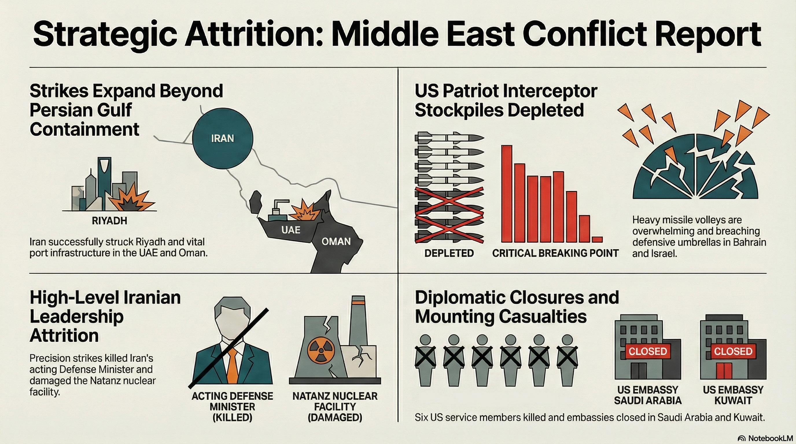The conflict has escalated with a direct Iranian strike on the U.S. Embassy in Riyadh, Saudi Arabia, and the expansion of the Iranian strike envelope to targets in Fujairah (UAE) and Salalah (Oman), outside the Persian Gulf. In Iran, the targeted decapitation campaign continues with the reported killing of the acting Defense Minister. Domestically, President Trump has publicly acknowledged that U.S. high-end munitions stockpiles, particularly Patriot interceptors, are “not where we want them to be,” confirming the depletion crisis previously warned of by Gulf allies.