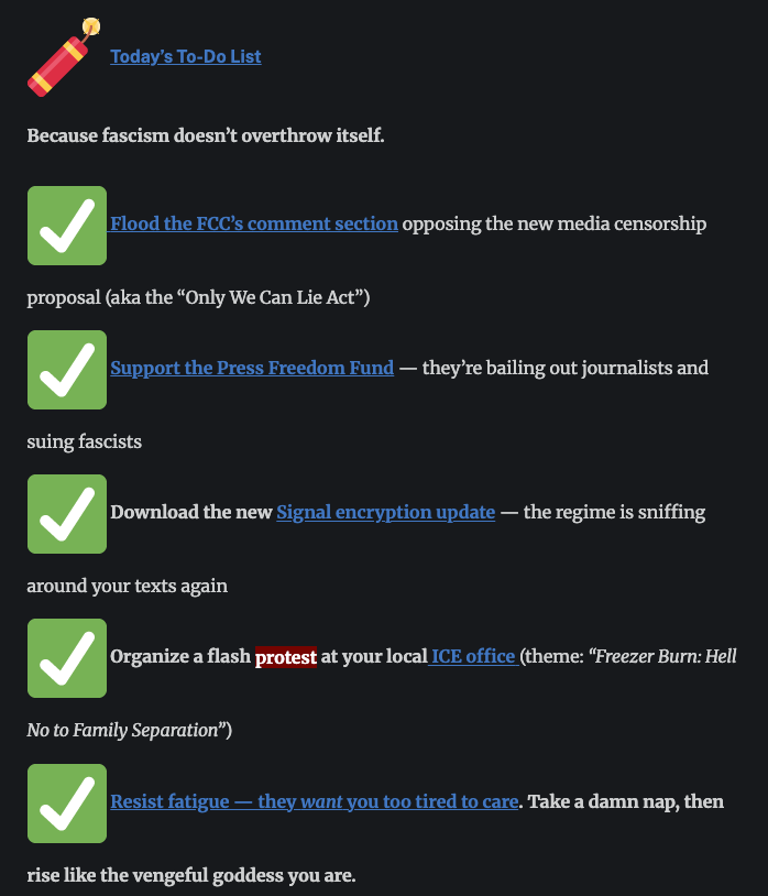 Finally, be sure to check out the Resistance Kitty newsletter, which always has great opportunities listed under “Today’s To-Do List,” because, as they say, “fascism doesn’t overthrow itself.”