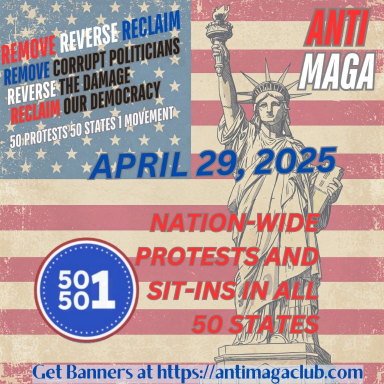 📅 Join the movement on April 29, 2025 for nationwide Anti-MAGA protests and sit-ins across all 50 states to remove corruption, reverse the damage, and reclaim democracy. Make a plan to show up and be part of the 50 States, 1 Movement action!